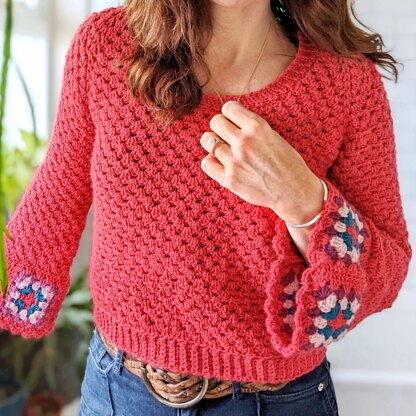 It is worked from the top down, in a raglan style. Because of the deep scoop neck it is worked back and forth at the start, then worked in the round. The body and sleeve length can be easily modified by adding or removing rows as you go. Both sleeve styles are included in the pattern. There is no sewing involved as the granny squares are crocheted together & onto the garment.
