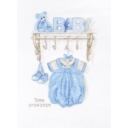 This counted cross stitch design by Luca-S, features a babies blue romper suit hanging under a shelf. The kit contains Zweigart 18 count white aida fabric, Anchor stranded cottons, needle, chart and instructions.