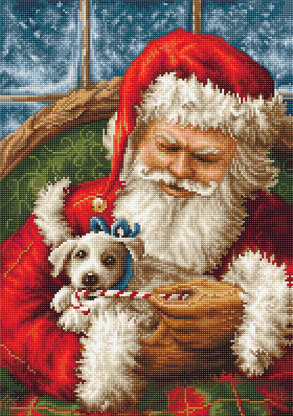 This traditional festive design is by Luca-S. Featuring a jolly Father Christmas cuddling a cute little white puppy - an ideal project for a Christmas gift or decoration.Kit contains: Zweigart 25 ct PointStitch canvas with printed gridlines, Anchor stranded cottons and chart. Design size: 14 x 20 cm.