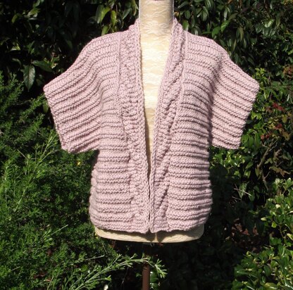 Such a useful shrug/jacket. Casual and easy to wear with over-sized armholes. The main background stitch is stocking stitch with the garter stitch ridges giving lovely texture. The front borders comprise a bold garter stitch cable with a three stitch stocking stitch outer edge, this frames the cable beautifully.