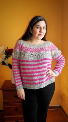 Lucila is a colorwork-lace yoke sweater inspired in the poem ***We were all going to be queens*** written by Gabriela Mistral. Shown in size L, on a 42” /106 cm bust. The sweater is intended to be worn with 0-4” of positive ease.
