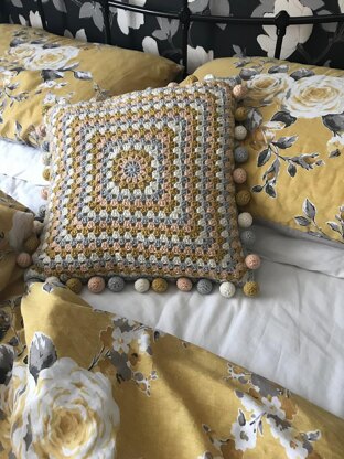 Traditional granny square technique is used to make this cushion. Use colours that delight you in DK weight yarn and have fun with the pom-pom trim. This pattern includes written instructions in UK crochet terminology. It's suitable for beginners.