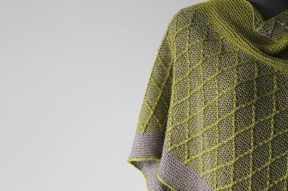Lugas is a two-tone shawl knitted sideways. The crossed stitches pattern brings texture to the garter stitch and shapes with a set of stripes and crossed / slipped stitches.