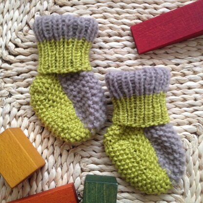 Luis booties - available in two sizes. Seed stitch and rib stitch with needle number 4. Two yarns are recommended - the grey one is more fluffy and the green one is a clean yarn which increases the elasticity of the cuff in rib structure.