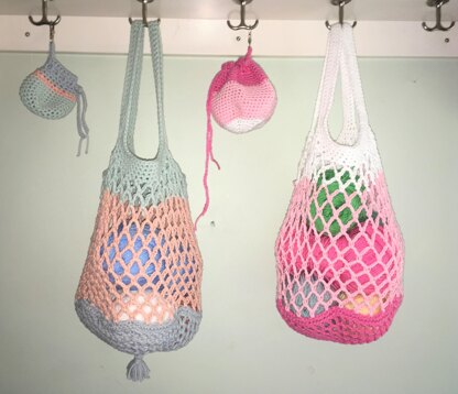 I also made a budget friendly version (pink/white) of the bag with Rico Creative Cotton Aran, the base diameter was 24cm and I used a 5mm hook. I had much more leftovers with this yarn so I made a larger coin purse.
