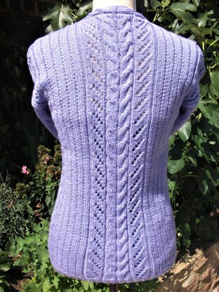 A very pretty sweater, with a deep V neck. The front and back are worked in a combination of simple lace and cable. The cables and lace panels are continued in one with the front to frame the V neck, with decreases worked within the background pattern only. The cables only, are then continued round to the centre back of neck and joined together to give a neat finish. The sleeves have a very deep rib shaped lower section with the rest worked in stocking stitch.