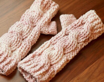 These cozy, stretchy fingerless mitts are constructed of 3 cables, a wide center cable flanked by two skinny cables. There are two versions: long arm-warmer and shorter hand-warmer. This pattern is designed as a companion to the Lynne Marie Cabled Cowl and Hat, and is also an homage to my lovely mother.
