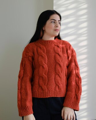 This sweater has a relaxed fit and uses basic cable patterns and seed stitches. You’ll knit two panels flat and bottom-up: one back panel and one front panel, with some neck shaping. Then you’ll knit the sleeves and the neck ribbing in the round.