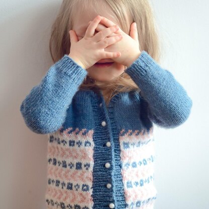 Magali Cardigan is a Fair Isle garment with a top-down raglan construction, paired with a pretty and easy colorwork pattern on the body. It is made with 3 colors of your favorite DK weight yarn, but as it uses such a small yardage, you can also work with leftover yarns, making this project a nice stashbusting idea. You can even make a second one with the same yarn to surprise your kids with a matching cardigan for their dolls and toys!