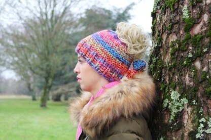 The Magic Bun hat is a convertible hat that may be worn as a messy bun or ponytail hat or quickly transformed into a stylish regular Pom pom hat!  It is quick to make and fun to wear!  It is crocheted with an easy stitch pattern using bulky weight yarn. Designed to be worn so that your hair can be pulled through the hole, great if you have long hair, a pony tail, or you just want your hat to fit over your bun, or simply pull the draw string for a closed hat on your hair down days 