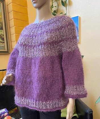 I always knit my patterns. Knitted top down, 3/4sleeves, rolled edges. You can knit it in round, or flat. I knitted flat and sewn on one edge.