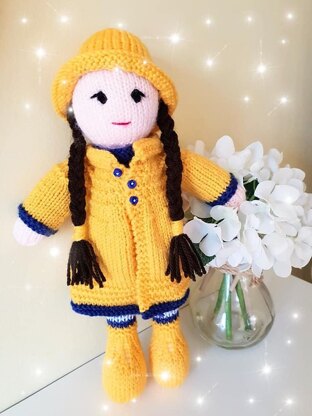 The body and head are knitted in one piece, bottom up and the raincoat is knitted top down.