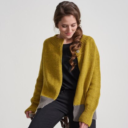 A cozy warm cardi, knit with big needles and a bulky yarn. The neckline is shaped by using the german short rows technique. The cardi is closed with one button at the overlapped front band.