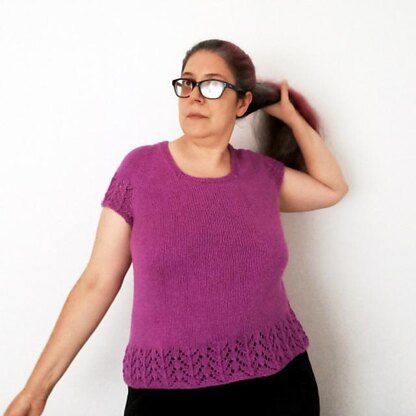 A feminine but linear tee with a slight negative ease, Malvarosa relies on the softness and drape of Malabar’s blend of cotton and silk to create a form-fitting garment that will settle on your shapes. The slight waist shaping, worked only on the back, and the variable breast shaping (you can choose between three options) will create the best fit for you. Malvarosa is knitted from the top down with square neck and raglan sleeves. The short sleeves are knitted flat and a short seam is worked on their underside.
