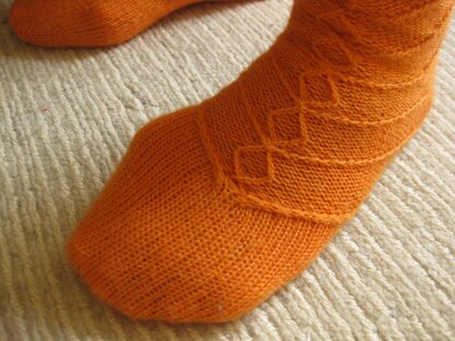 My friend Stefanie asked for some bright orange socks for her birthday. I was free to design what I wanted to knit and had fun with some small cables.