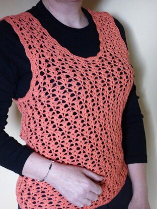 This is a close-fitting lace crochet top that you can use as a versatile layering piece. It is made all in one piece, from the bottom upwards, and there are only the shoulder seams to sew together.