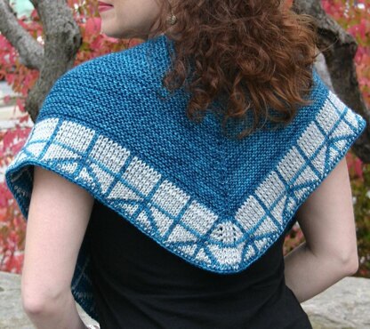 This reversible shawl starts at the bottom edge with a double knit motif inspired by the Manhattan Bridge. The rest of the shawl is worked in garter stitch that quickly decreases to give a V-shape that sits comfortably on your back.