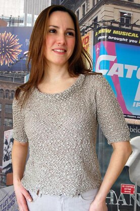 This one-piece, top-down tee has fitted shoulders worked with a vertical decrease from just below the shoulder to just above the armhole. The above-elbow sleeves are tapered with short rows on the underside of each sleeve. Reverse stocking stitch on the outside of this drape-neck tee gives it an unusual texture. Hem and cuffs are finished in k1, p1 rib. With YO (yarn over) underarm shaping, this pattern is intermediate. Skill level: EASY (without short rows)
