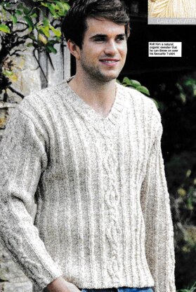 This is a pattern for a man s able and rib jumper, originally published in Knit Today. It is in a simple rib stitch with a cable at the centre front and centre of sleeves. Photos Knit Today.