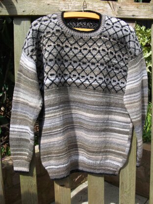 This is a simple shaped, easy fit, dropped shoulder sweater. Although it has a stranded yoke in 1 contrast colour, it is in fact quite a straightforward knit. It looks more complicated because of the lovely shading effect of the main yarn colour.