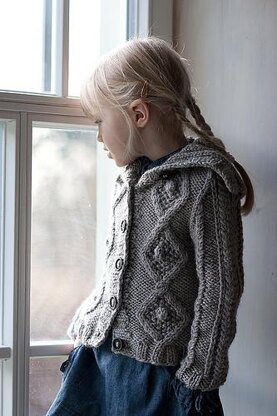 Manti is a close fitting cabled cardigan for both, boys and girls, with a bit of vintage touch. The body of the cardigan is worked seamlessly from the bottom up and sleeves in the round until underarms, and then joined at yoke. Both collared and hooded version are given. Sizes available: 1-1.5 (2, 3, 4, 6, 8, 10) years; finished chest circumference 21.5 (22.5, 23.5, 24.5, 26.75, 29, 32) in/ 55 (57, 60, 62, 68, 74, 80) cm Length from bottom to armhole: 7.25 (7.75, 8.5, 9, 12, 12)in / 18.5 (19.5, 22, 23, 31, 30, 30)cm Armhole depth: 5.5 (5.5, 6.25, 6.25, 6.75, 7, 7.5)in / 14 (14, 16, 16, 17, 18, 19) cm
