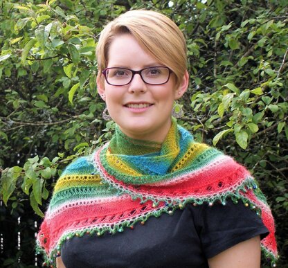 Beautiful shawlette which is easy to wear and fun to knit, which features an interesting elongated crossed stitch pattern, yarn over rows and a pretty beaded picot cast off (beads are optional).