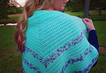 This shawl was inspired by camping. While we were camping at a wonderful historic campground, I noticed that I could use a warm squishy shawl to wrap around my shoulders while sitting in front of the campfire. I wanted something simple but stylish. I think this shawl is both simple and stylish, you only use three stitches and if you mess up it is very easy to fix, you could also customize this with ease. The simple stripes with a contrasting color make this very stylish.