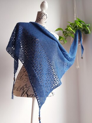 Marea is a triangular shawl, with an elegant lace pattern, shaped with a touch of short rows. Charms or tassels can be added at the angles.