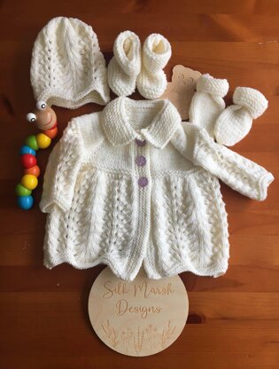 Our Margaret baby pattern contains knitting instructions for a matinee jacket/cardigan, hat, mitts and booties.