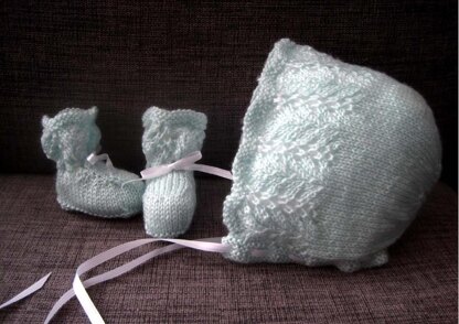 - A gorgeous traditional style bonnet and matching booties set featuring the pretty (yet easy to knit) Marguerite Lace pattern.