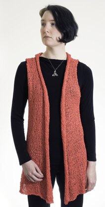 Skill level easy Size XS (S, M, L, 1X, 2X, 3X). Sample knit is small size. Finished Measurements****Chest at underarm 34.5 (38.25, 42, 46.5, 51, 54.75, 58.5)” with collar rolled Finished Length 26.5 (27, 27.5, 28, 28.5, 29, 30)” measured at side edge. Armhole 6.5 (7, 7.5, 8, 8.5, 9, 10)”