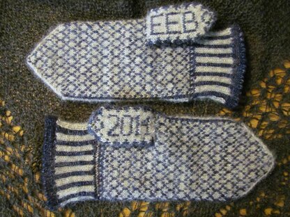 This pattern contains colorwork, cables, and beads! On the inside of the right thumb there is a spot for you to place your recipients (or your own) initials, and the inside of the left thumb has a space for you to place the year.