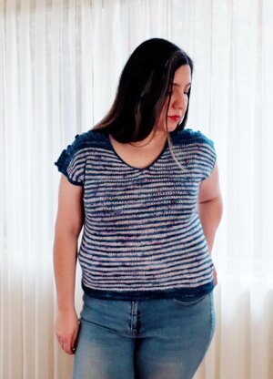 Inspired in the french riviera, MARIN, is my version of the classic navy tee. Marin is elegant and versatile. Knitted for the top down, makes it very easy for you to change the length. The lace insertions are knitted first, then short rows shapes shoulders and finally you will works in stripes and join front and back in the round for work the lower body.