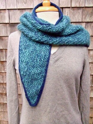 About the Design: This is an easy-to-knit and wear triangular scarf / mini shawl. It is knit from the center bottom outward, with Applied I-cord, and can be knit to any width. I’ve sampled it in squishy, soft, YarnUndyed 100% superfine merino, as well as in frothy Cascade Yarns Kid Seta in a shimmering aquamarine held with Kraemer Yarns Stotts Ranch Limited in navy.