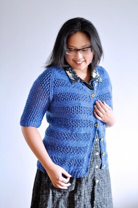 Markdale is a breezy, seamless cardigan featuring elbow length lace sleeves and a casual fit. Stockinette and lace bands are easy to work and surpisingly quick to knit up. Markdale is perfect for making the most out of a few skeins of fingering weight yarn, and is a flattering layer over dresses and tees. The lower body is worked flat from the hem to the underarm then joined with the sleeves to work the seamless raglan yoke. A simple round neck and ribbed bands complete the cardigan.