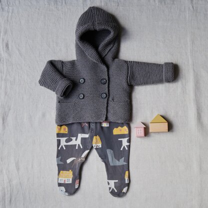 Featuring a snuggly hood, turn-back cuff sleeves, and neat in-set pockets, the Marlow combines practical details with classic charm. The clean lines and texture of garter stitch make it wonderfully tactile and comfortable for baby, while the thoughtful design ensures a perfect fit from newborn to 12 months.