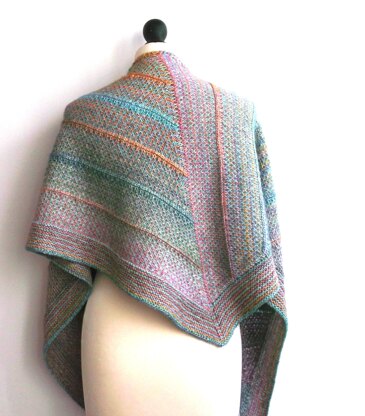 Alternating two rows of each yarn, this triangle shawl has blocks of a slip stitch pattern, separated by lateral braids. Work triangle one top down, then pick up stitches down one side to work triangle two sideways.