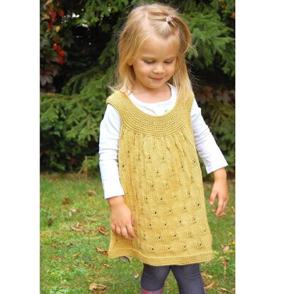 Marple is a lovely dress, which is completely seamless, top-down. This will grow with your little girl into a tunic top, and has a lot of positive ease. The length can easily be adjusted. Marple looks great over a long sleeve shirt and tights for winter and as a summer frock. Come to find out, this looks just as pretty inside out, so you get 2 looks for the price of 1. Plus I love this pre-block as much as after blocking. Suitable in wool or cotton. The lace is written and charted.