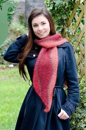 The scarf is quadrilateral in shape, with one end narrower than the other. It is knitted sideways using short rows technique to create 2 assymetric wavy lines all along the length of the scarf. A unique design with vibrant colours similar to the Morroccan spices to brighten up the short & dull days of winter, at the same time it is warm, light and silky by use of kidsilk yarn.