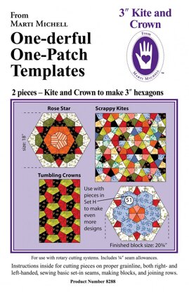 Kite and Crown, 2 pieces to make 3 inch hexagons, coordinates with Set H #8951. As hexagon quilts are more and more popular, quilters’ wishes for more shapes in the hexagon family must be answered. Happily, both of these shapes also can be used for very nice One Patch scrap quilts.\n\nThe Kite and Crown shapes are also used to make the popular Rose Star block and instructions are included for one variation. Best of all, this template set coordinate with pieces in Set H, so you can have even more fun with hexies!