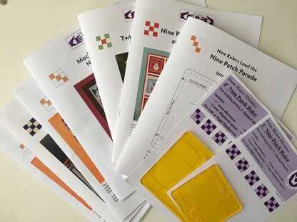 The Nine Patch Parade Starter Set includes six 8.5 x 11 inch pattern booklets (12 to 20 pages each) and 2 Nine Patch Rulers that make 3-inch and 4-inch Nine Patch blocks. The "no math" Rulers combine accuracy with strip techniques. Each pattern includes details for making a quilt that can be easily completed in one month, plus additional designs and info for making other versions. The information contained in the pattern set adds up to a great resource for "all things Nine Patch." Patterns are not sold separately and are only available in the Starter Set. No substitutions. (Nine Patch Rulers are sold separately -- see "Related Products" below for complete ruler details.) Look for "The Other 5 Nine Patch Rulers" bundle special soon to complete your set of Nine Patch Rulers.\nSize: 8.5in x 11in Booklets, 3in and 4in rulers\n