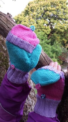 Flip-tops are worked first from the top down, then placed on hold. Hand is worked from the wrist up and joined to flip-top, then the thumb is worked. Directions are given for three-colour version, for a plain mitten simply use one colour throughout. Sized for palm circumference 17 (19, 21, 23) cm which will suit Child (Teen, Adult M, Adult L).