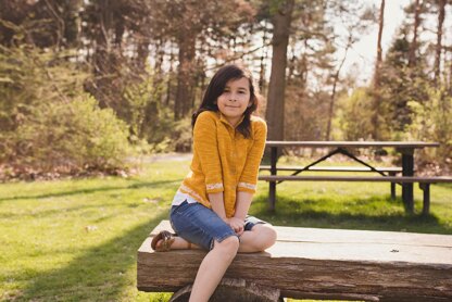 This bright girls’ cardigan uses slipped stitches to create subtle scallops around the collar, hem and cuffs—no complicated stranding, no steeking! Trimmed with garter stitch, it features ¾ length sleeves and an a-line shape reminiscent of 60s era girls’ coats and dresses.