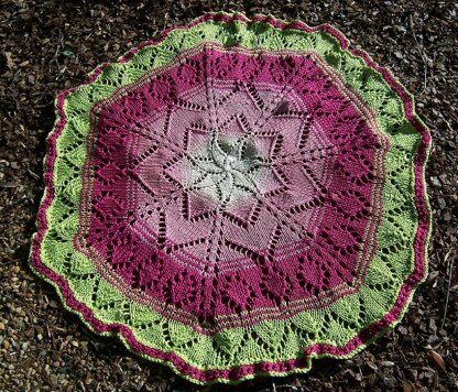 Worked in the round and starting at the center, you create a spiral-petaled focal-point. Switching to #10s and spoke increases, you begin to work shades of pink in the petals. I have added a few rounds of striping between the color changes to avoid harshness and blend the colors better. The final rounds are lime green leaves with a touch of the bright prink at the very edge.