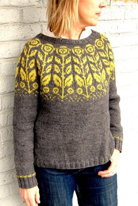 MARYANNA is a garden-inspired sweater that is knit seamlessly on circular needles from the top down. The yoke features colorwork in a folksy floral motif. One of my goals in designing this pattern was to create colorwork that is not too difficult for relatively new knitters to navigate, yet engaging for experienced knitters; only two colors are worked throughout the yoke at the same time, and most rows have short floats. Maryanna is designed to be slightly cropped and loose-fitting. (This pattern is written for three sizes.) The neckline has short row shaping; additional short rows at the back hem create a figure-flattering shape. Sleeve length and body length can easily be adjusted to suit your individual preference.