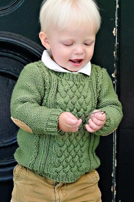 This refined sweater design captures the beloved stitch and cable components of the Master Charles Cabled Ear Flap Hat. It’s worked in the round from the bottom up with set-in sleeves. Stitch pattern is surprisingly simple and you’ll delight in watching your progress. Just try not to slow down too much from all the project petting. Sweater modeled in size 18 months and finished with suede elbow patches.