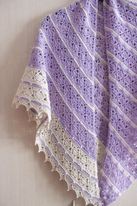 The pattern sample uses 3 skeins of fingering weight yarn (427 m per 100 g) to create a classic looking large size shawl - 2 skeins of main color (lavender) and 1 skein of contrasting color (cream) and switches colors for the final repeats for better use of the available yarn, which created a lovely border effect (and is totally optional).
