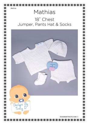 Mathias is a Baby Knitting Pattern for a short-sleeved jumper, pants, socks and a hat to fit a baby 18" chest and is made using DK yarn and 4mm needles. This Baby Knitting Pattern requires 200g of DK yarn
