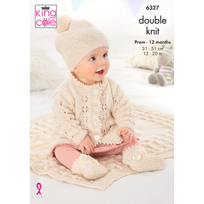 Matinee Coat, Cardigan, Hats, Bootees and Blanket in King Cole Glitz DK - 6327 - Leaflet is a Intermediate Knitting pattern by King Cole, available as a Leaflet and includes instructions in English. Super fun to make, this pattern could be your next masterpiece!