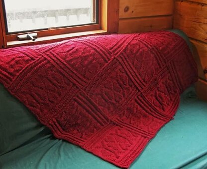 It’s fully reversible thanks to ribbed cables and a jersey/guernsey style center motif, and works up quickly thanks to the use of bulky yarn. Because it is made of blocks sewn together, you can adjust it to any size you wish, by making more or less blocks. It is finished with a simple single crochet border, easy enough for the non-crocheter.
